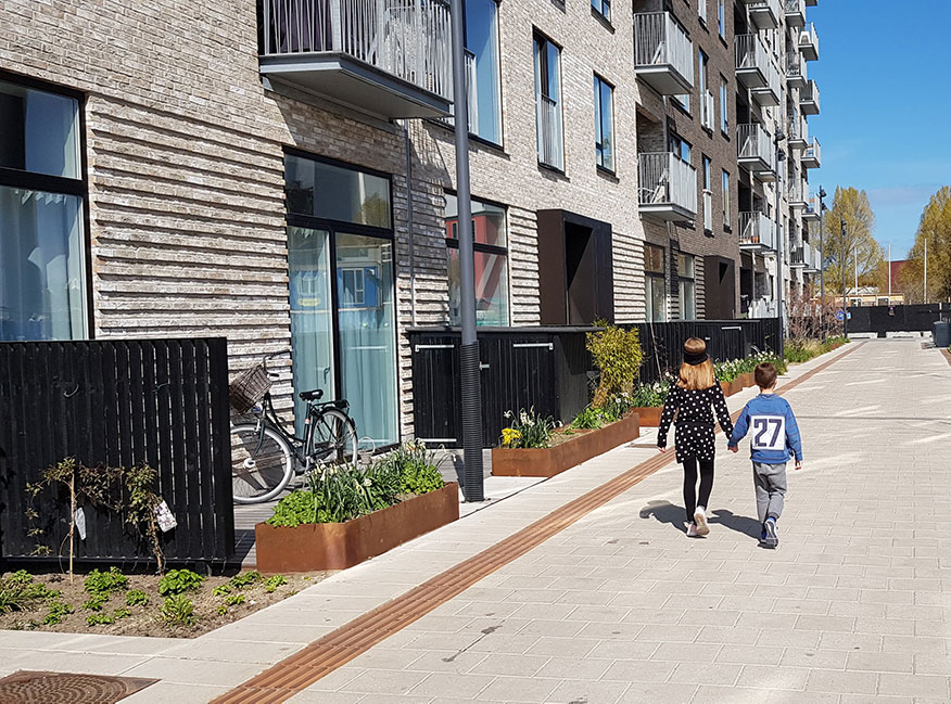 Plenty of young trees and greenery have been planted in planting boxes, which help to create a beautiful aesthetic between the newly built homes in the approximately 80,000 m² area. With the flexible edging system, various planting boxes have been created with varying heights and expressions – from an understated edge around the beds along the path to raised planting boxes with young trees.